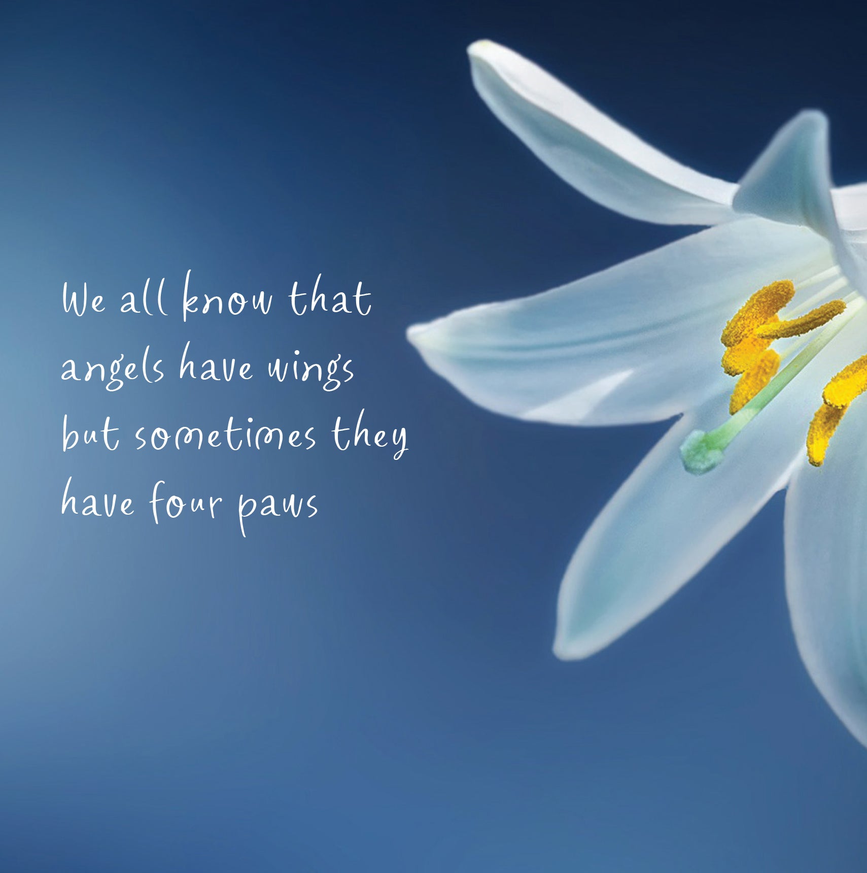 We all know that angels have wings but sometimes they have four paws sympathy card features a white lily against a dark blue sky and is for any pet with 4 paws. The message inside reads: 'Thinking of you at this sad time' An animal lover who recently lost their pet would really appreciate you sending a card like this to them.