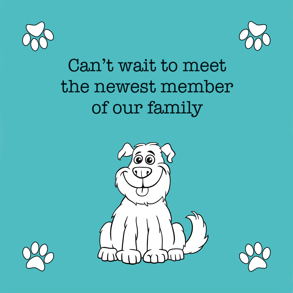 This is the perfect card for welcoming a new member into your family. Our Can't wait to meet the newest family member is ideal to send from a furry family member or a human!!! With four paws and a cute dog on an aqua green background any animal lover welcoming a new addition would enjoy receiving this card.