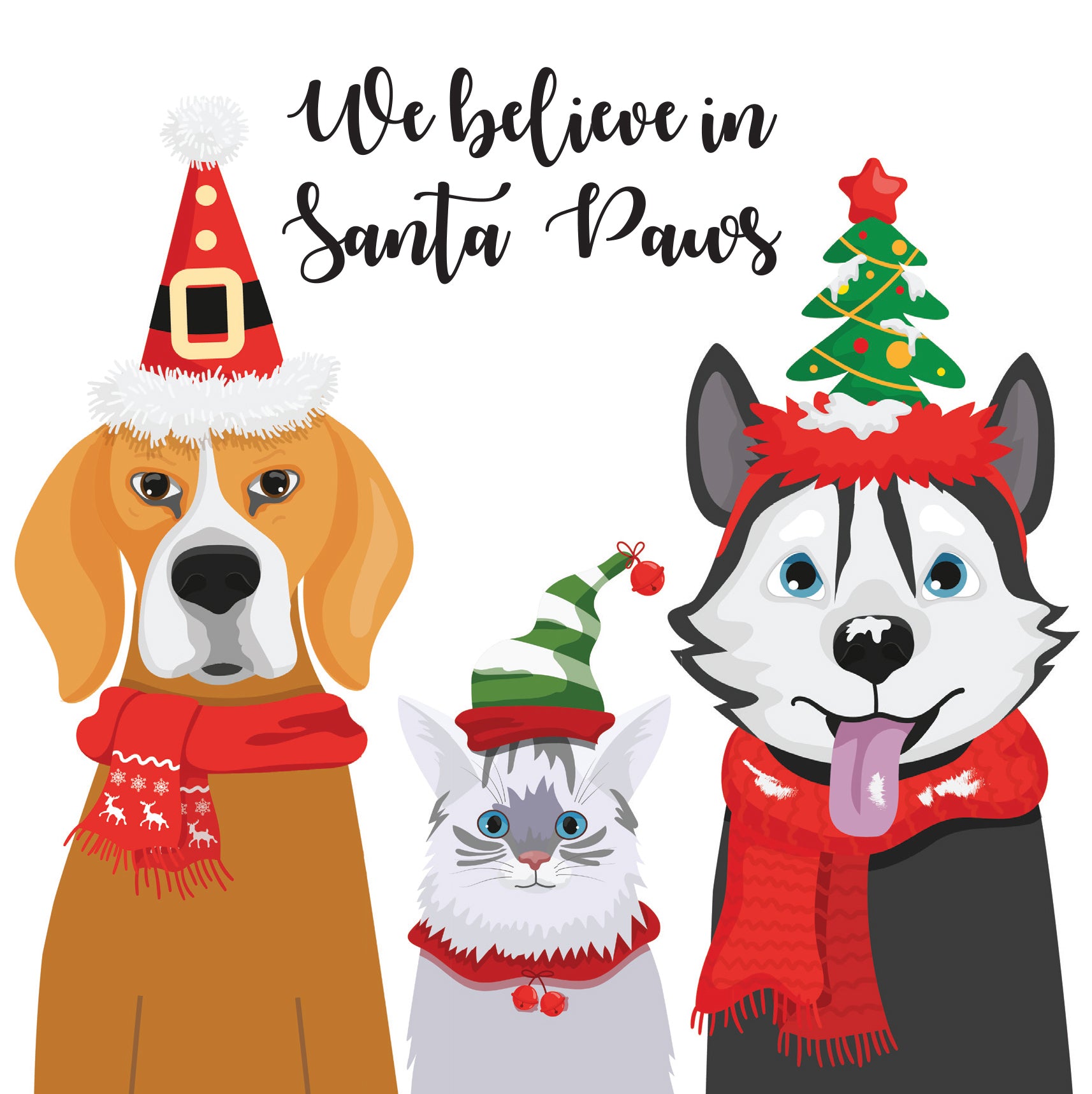 This Christmas card features two happy dogs and a cat who Believe in Santa Paws whilst wearing novelty hats and red scarfs - all trimmed with bells and Christmas motifs. Each card has a festive banner along the top of the inside of the card. This card is sure to impress any cat lover.