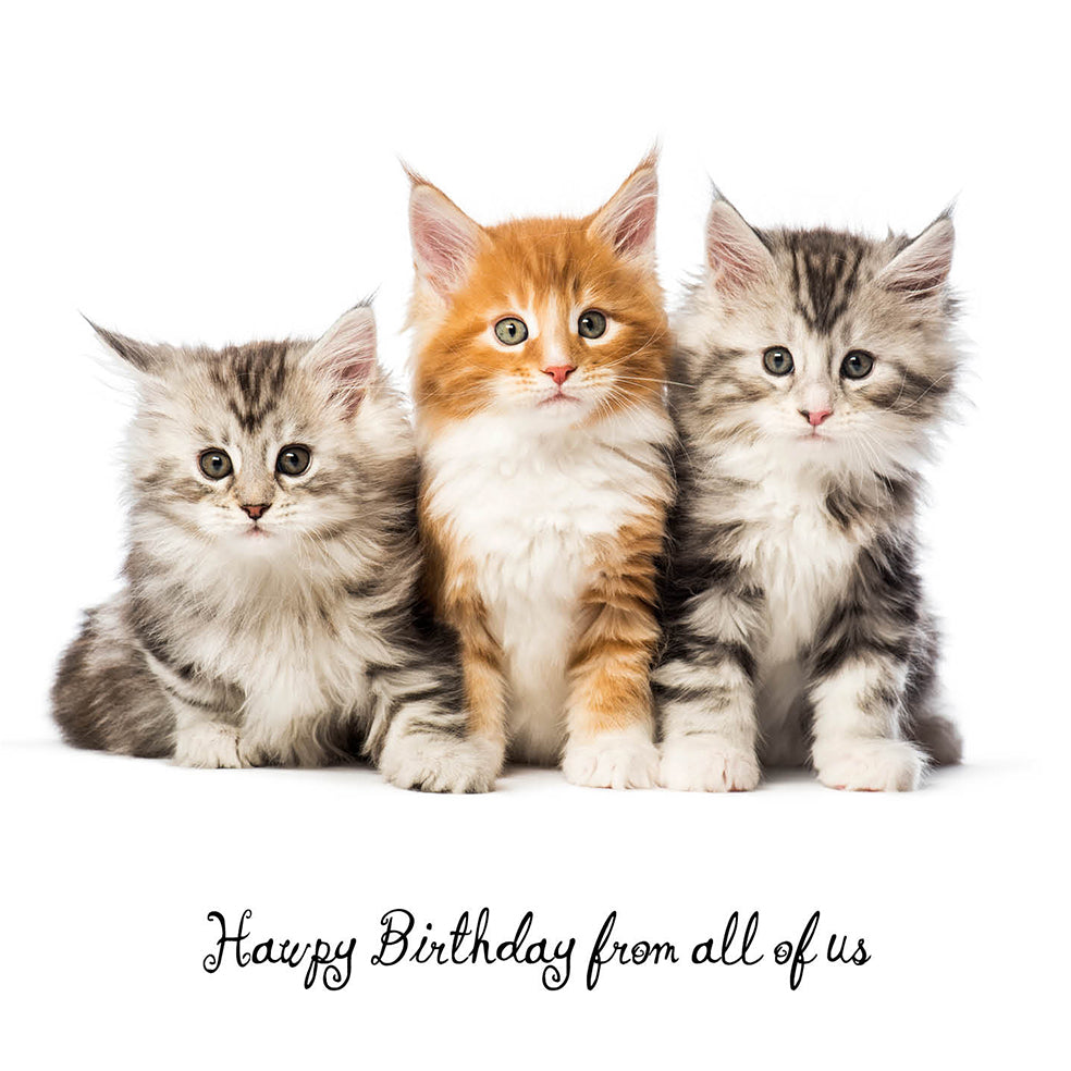 This birthday card features a group of Kittens wishing you a Hawpy Birthday from all of us. It is blank inside for you to finish a birthday message in whatever way you want and is an ideal card for you or your pet to send to a kitten fan, an animal lover or an important person in your life.