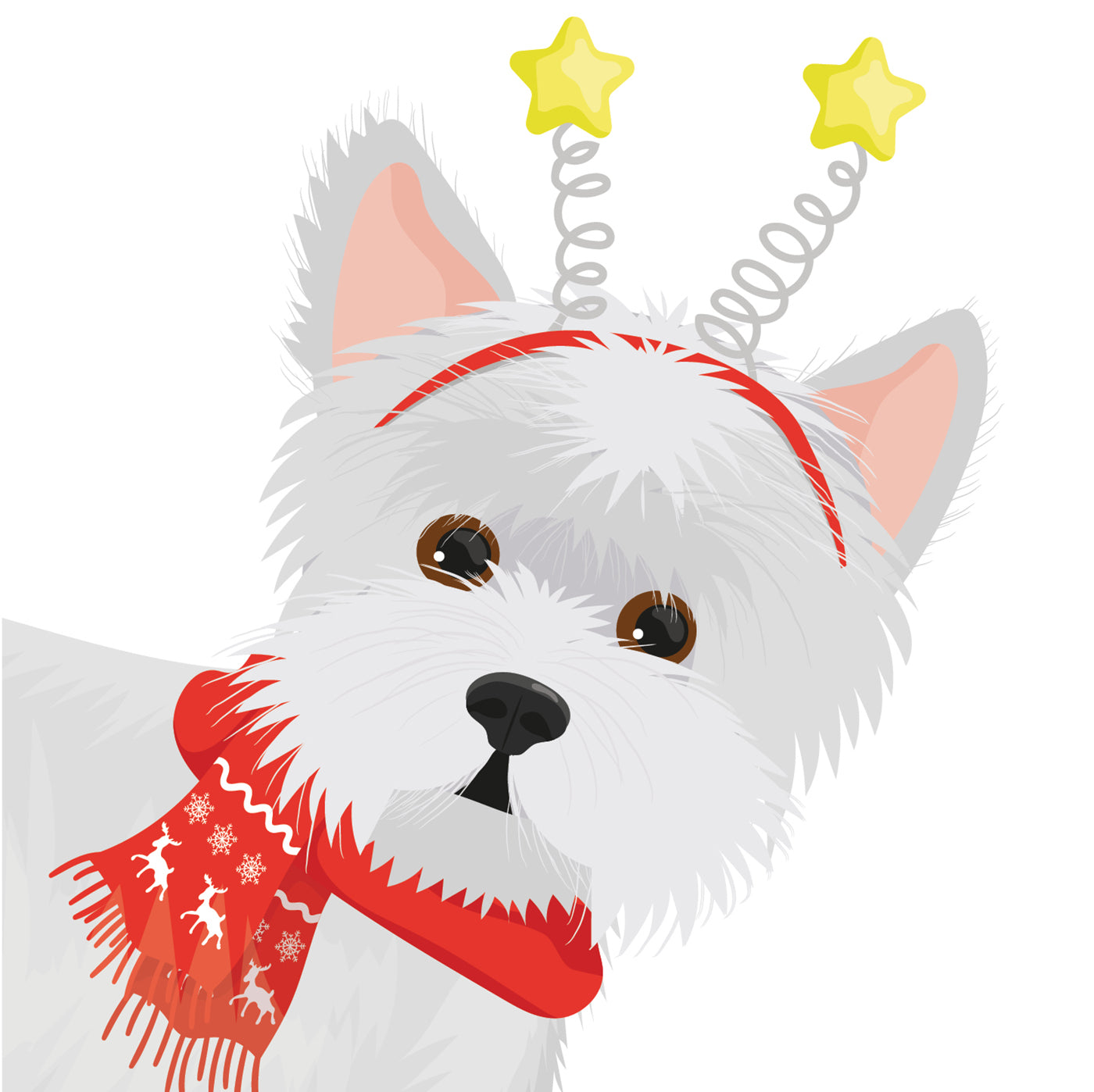 This Christmas card features the cutest west highland white terrier dog with a festive red scarf and a headband with bouncing yellow stars. There is a festive decoration banner along the top of the inside of the card. This card is sure to impress any dog lover.