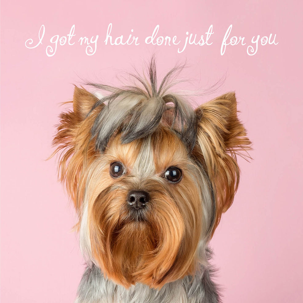 This birthday card features a gorgeous Yorkie with a ponytail in their hair saying I got my hair done just for you. The message inside reads: Happy Birthday, it is an ideal birthday card for you or your pet to send to a Yorkie fan, an animal lover or an important person in your life.