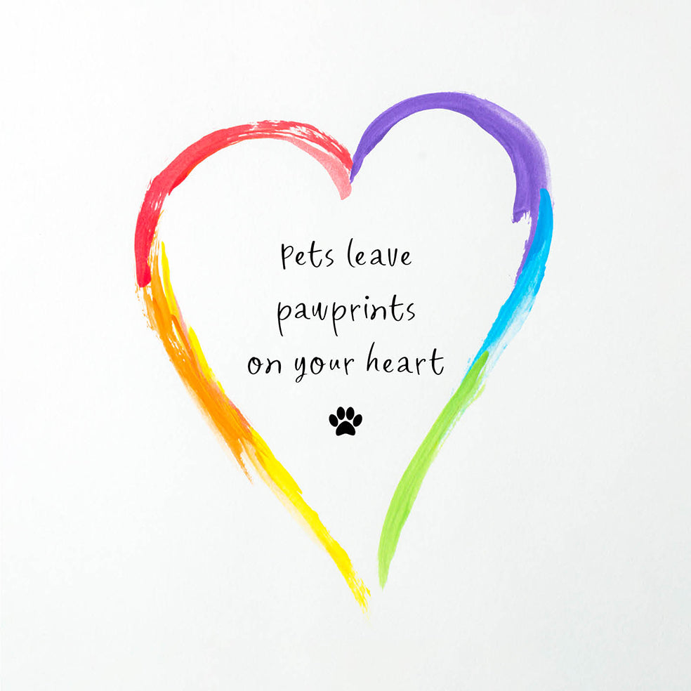 Pets leave pawprints on your heart this sympathy card features a rainbow illustration with a simple paw print. The message inside reads: Thinking of you at this sad time. This is a heartfelt card to send to someone you love that has recently lost a pet.