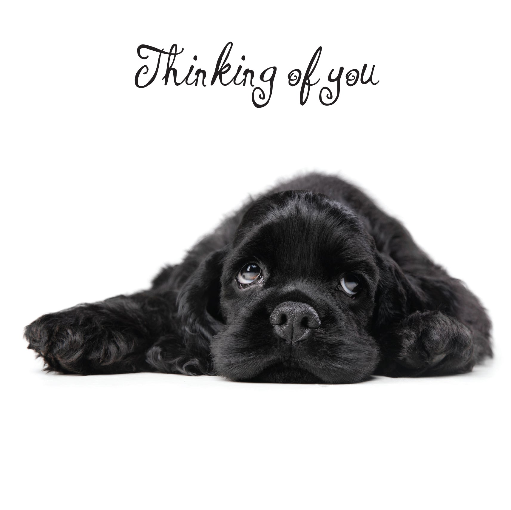 This card features a relaxed black Cocker pup saying Thinking of You, it is left blank inside for a message and could be sent to an animal loving friend thats in need of cheering up or a kind message from you or your pet.