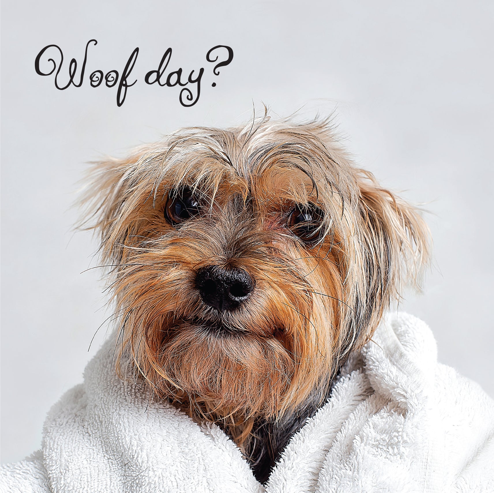 This card features a dishevelled Yorkie dressed in a white dressing gown saying Woof Day? The message inside reads: Hope you are feeling better soon. This would be a lovely card for sending a message to someone who is not well or a bit under the weather.